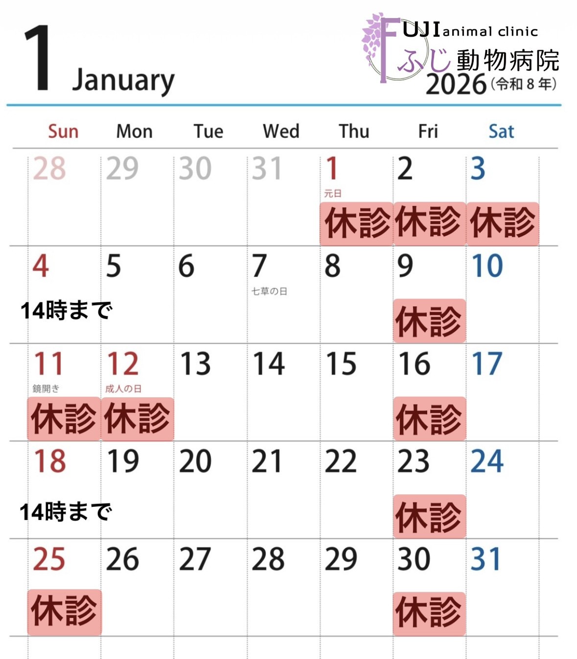 ※2月1日㈰は獣医師不在の為、臨時休診とさせて頂きます